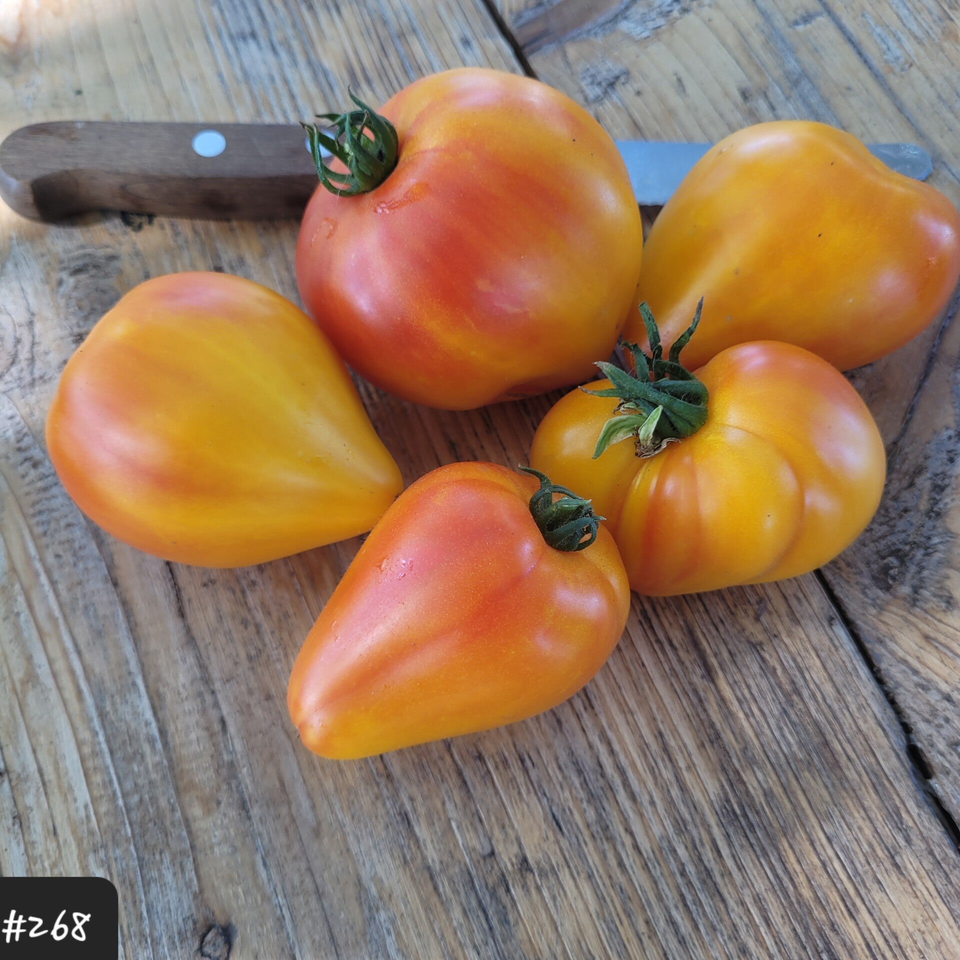 Diese mittelgroßen schön geformten Herzen sind wunderschön mehrfarbig. Sie sind grötenteils gelb mit mehr oder weniger roten Bereichen. Das Fruchtfleisch ist mit roten Streifen durchzogen.