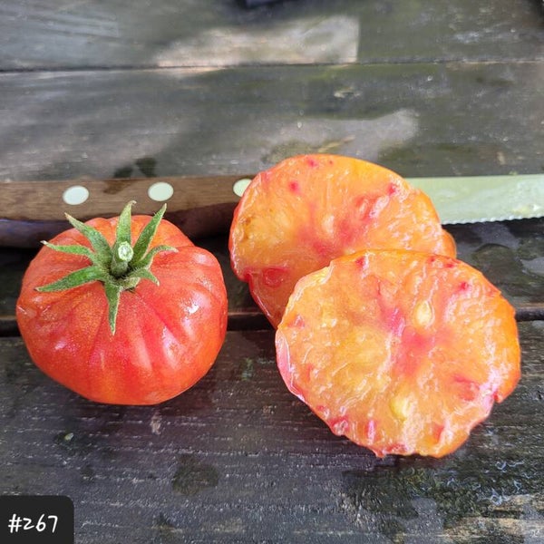 Diese schöne Fleischtomate von Vitaly Aalifirov aus Kasachstan ist vorwiegend rosa-orange mit gelben Bereichen. Das Fruchtfleisch ist mehrfarbig, sehr sehenswert gelb und rot marmoriert.