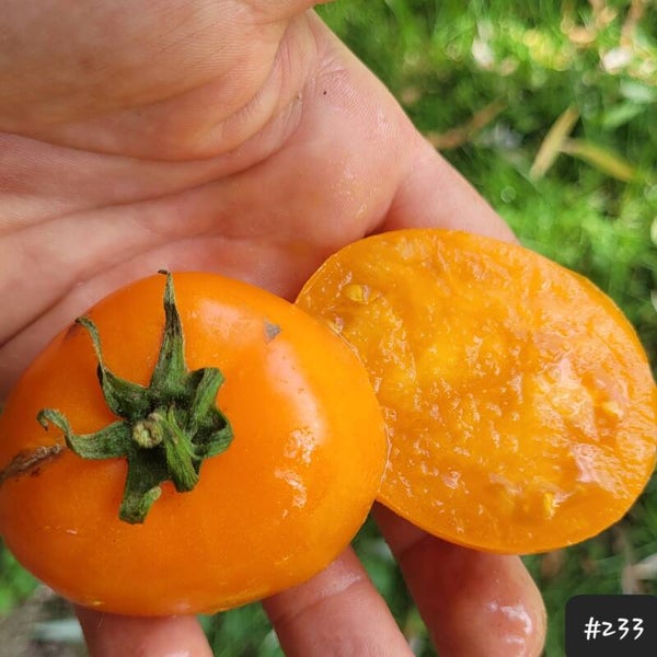 Die orangene mittelgroße Fleischtomate, Typ Beefsteak, flachrund und leicht gerippt.
